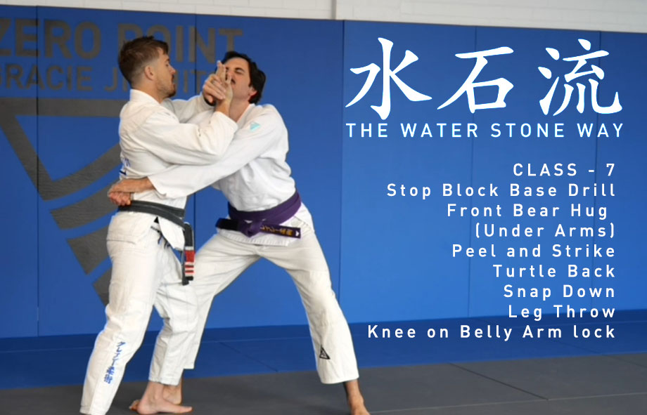 WATER STONE WAY - Class 7 Stop Block Base Drill Front Bear Hug (Under Arms) Peel and Strike Turtle Back Snap Down Leg Throw Knee on Belly Arm lock